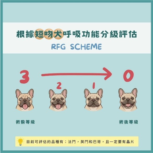 過程中,醫師依據 RFG SCHEME 短吻犬呼吸功能分級 進行評估,從最嚴重的第3級(呼吸受限甚至有休克危機),到後續穩定改善至第0級(接近正常),每一步都是慢慢累積而來